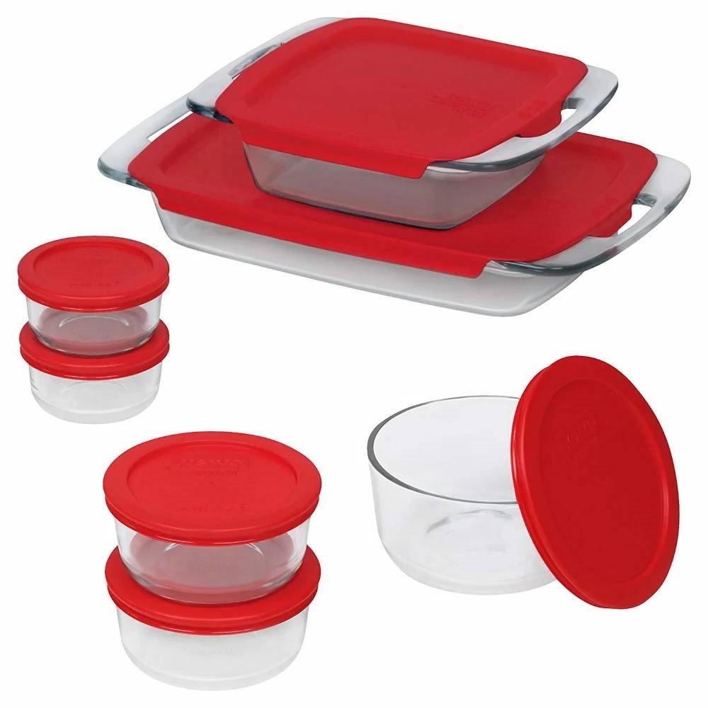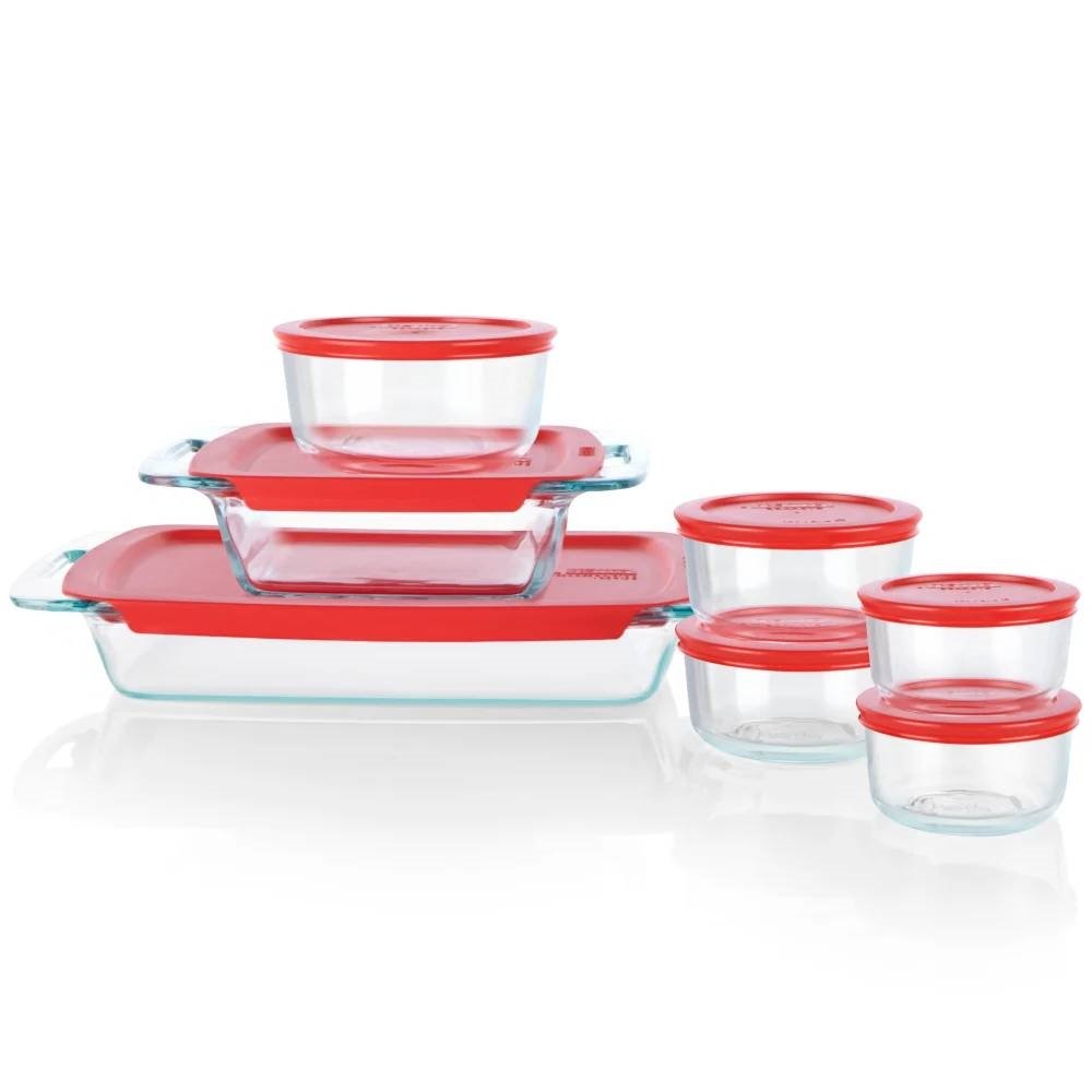 The 14-Piece Glass Bakeware Food Storage Container Set with Red Plastic Lids allows stacking for efficient space utilization. There's no substitute for Pyrex, the original glass bakeware. Introduced 90 years ago and made of durable, high-temperature material, Pyrex remains the ideal medium for safe, dependable food preparation.