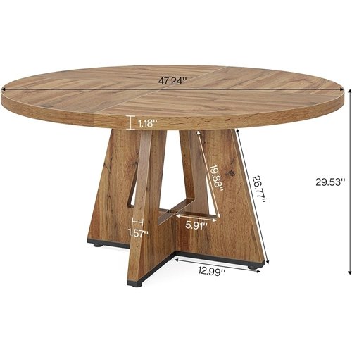 This Farmhouse Retro Oak Round 47-in Wooden Kitchen Table exhibits a charming farmhouse look and warm retro brown color, adding rustic elegance to any room. With its spacious 47-inch tabletop, this round dining table comfortably seats 4 people, perfect for dinner parties or family meals. Built from high-quality thick MDF, this table is durable, waterproof, scratch-proof, and easy to clean, promising long-lasting usability. In addition to dining, this table can serve as a study or work table or as a striking centerpiece in your living room, showcasing its versatile design. Comes with clear instructions and necessary hardware, this table is easy to assemble. We are here to assist with any queries about the rustic round dining table.