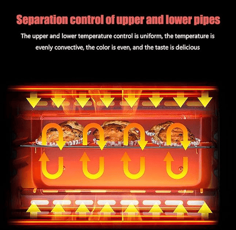 ✔ Even Heating (image shows convection arrows) – Separate control for upper and lower heating pipes ensures uniform cooking results.